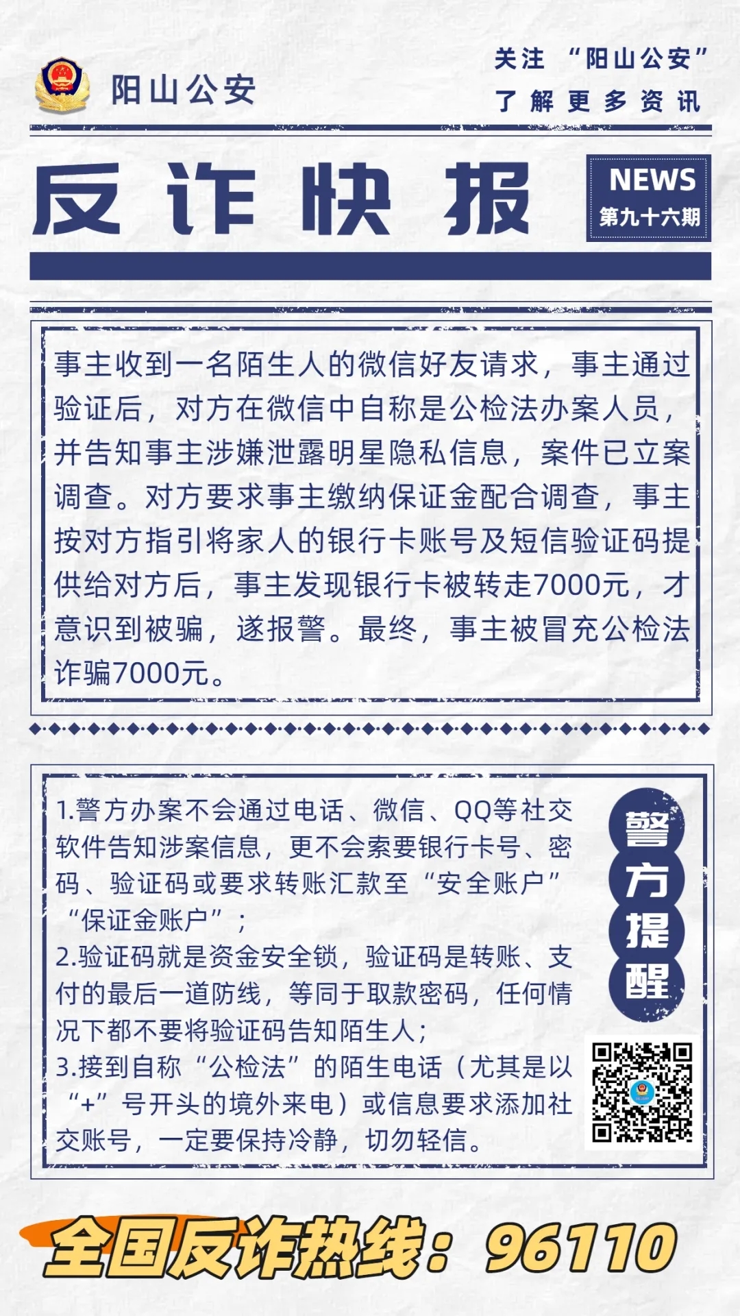 【反詐快報(bào)96期】女子被“公檢法”電話恐嚇,銀行卡瞬間轉(zhuǎn)走7000元