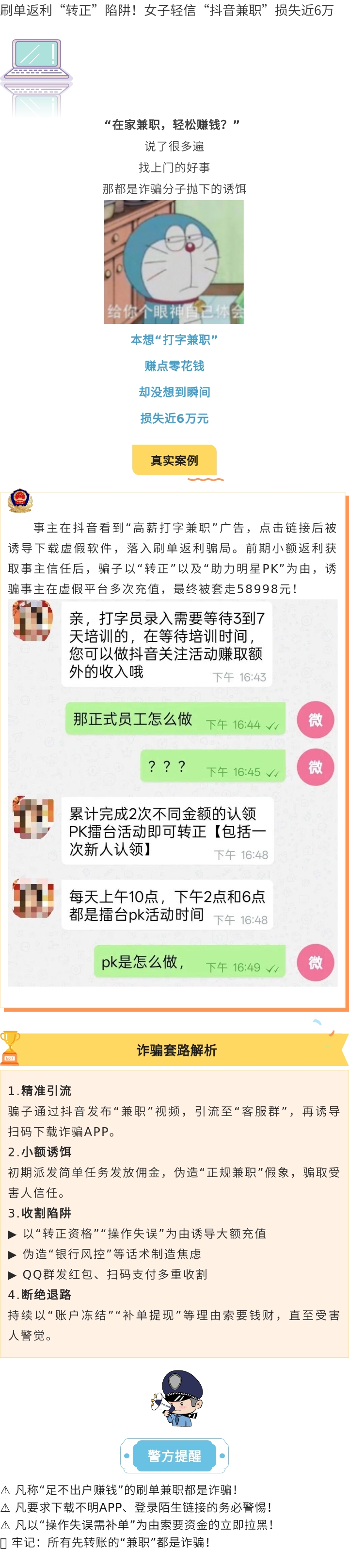 刷單返利“轉(zhuǎn)正”陷阱!女子輕信“抖音兼職”損失近6萬(wàn)